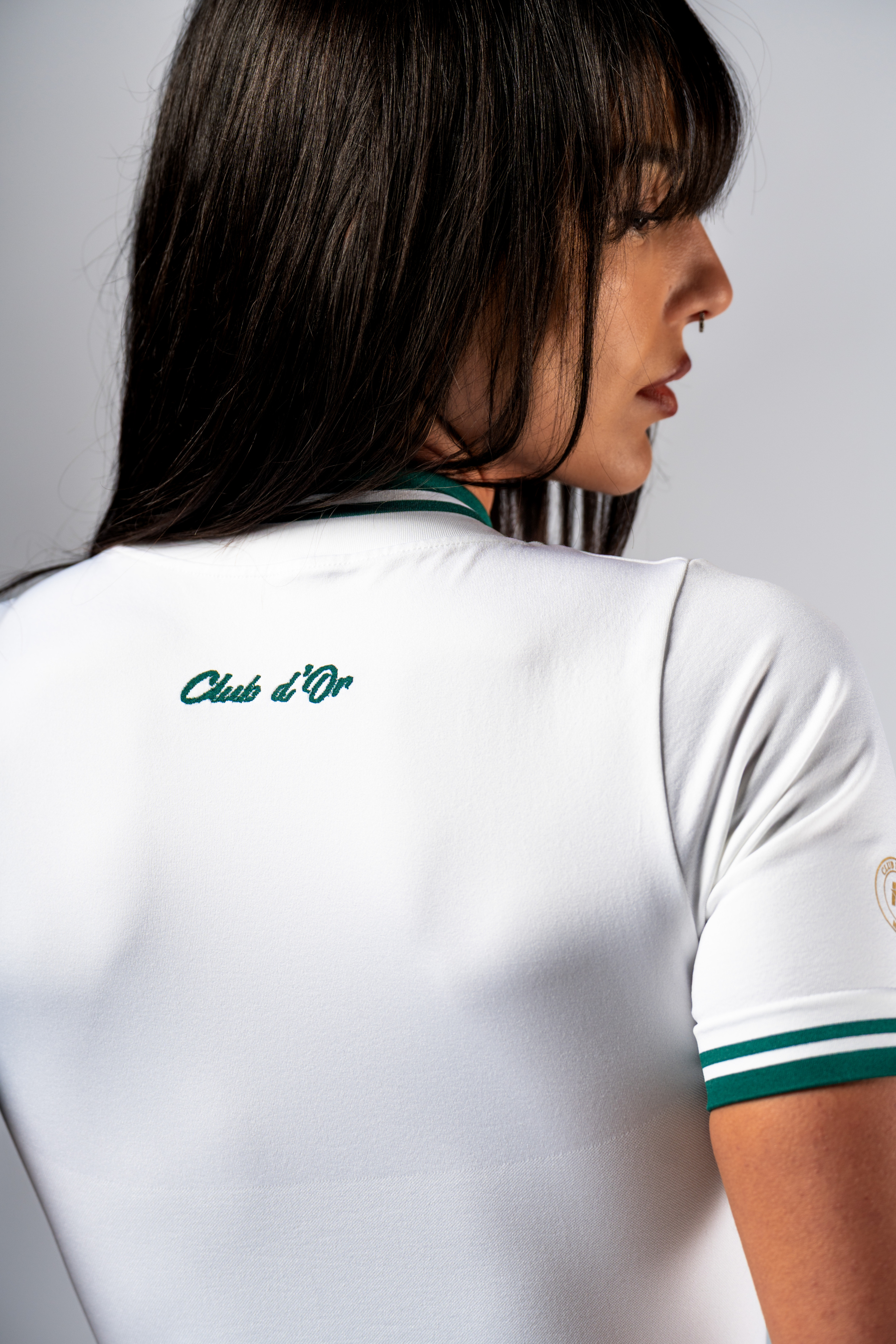 Фирменная эстетика: Контурные линии глубокого зелёного цвета и золотой логотип Club D’Or добавляют изысканные штрихи к чистому белому базису.